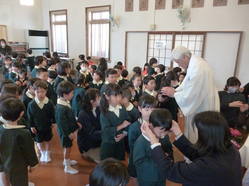 神父様から一人ひとりお祈りをしてもらい、おメダイをいただきました。